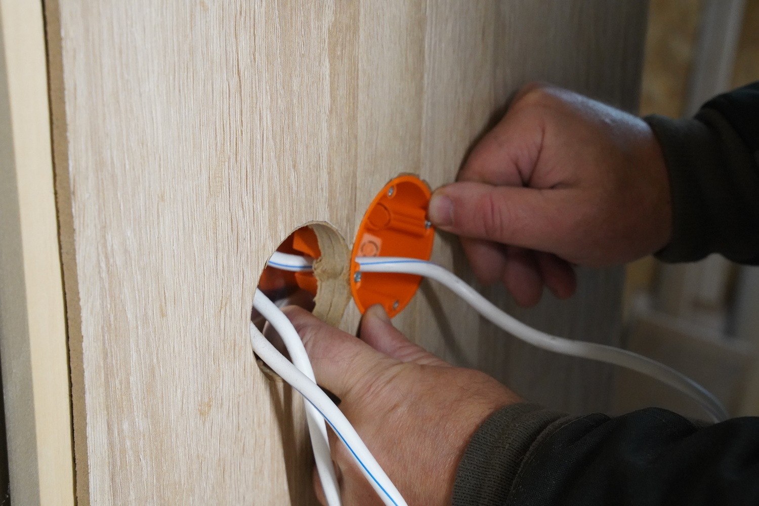 The electrical installation box is recessed into the laminate panel. The edges are trimmed with a sharp knife. On the other side, the installation box is secured with special wings.
