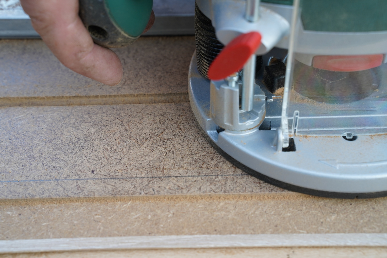 The router is pushed along the guide rail. The guide rail is more convenient because the rubber on the bottom presses down, ensuring the router stays firmly in place.