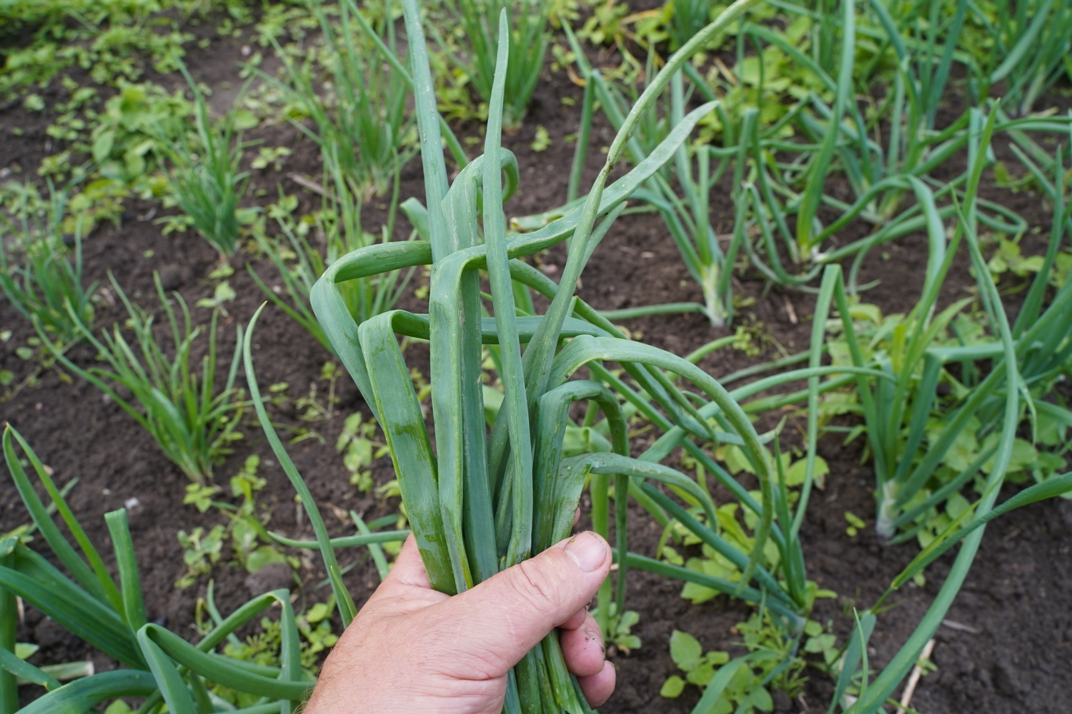 When the bulbs begin to form, the soil around the onions is loosened up to the middle of the bulbs, ideally after rainfall when the soil is soft. To help the bulbs store better, the stems are bent a few weeks before harvest.