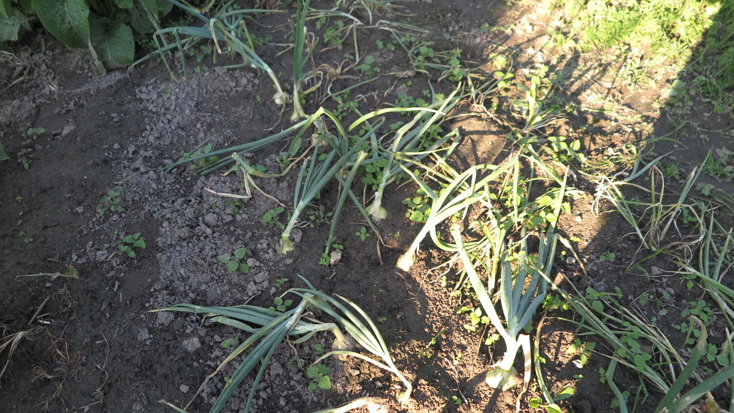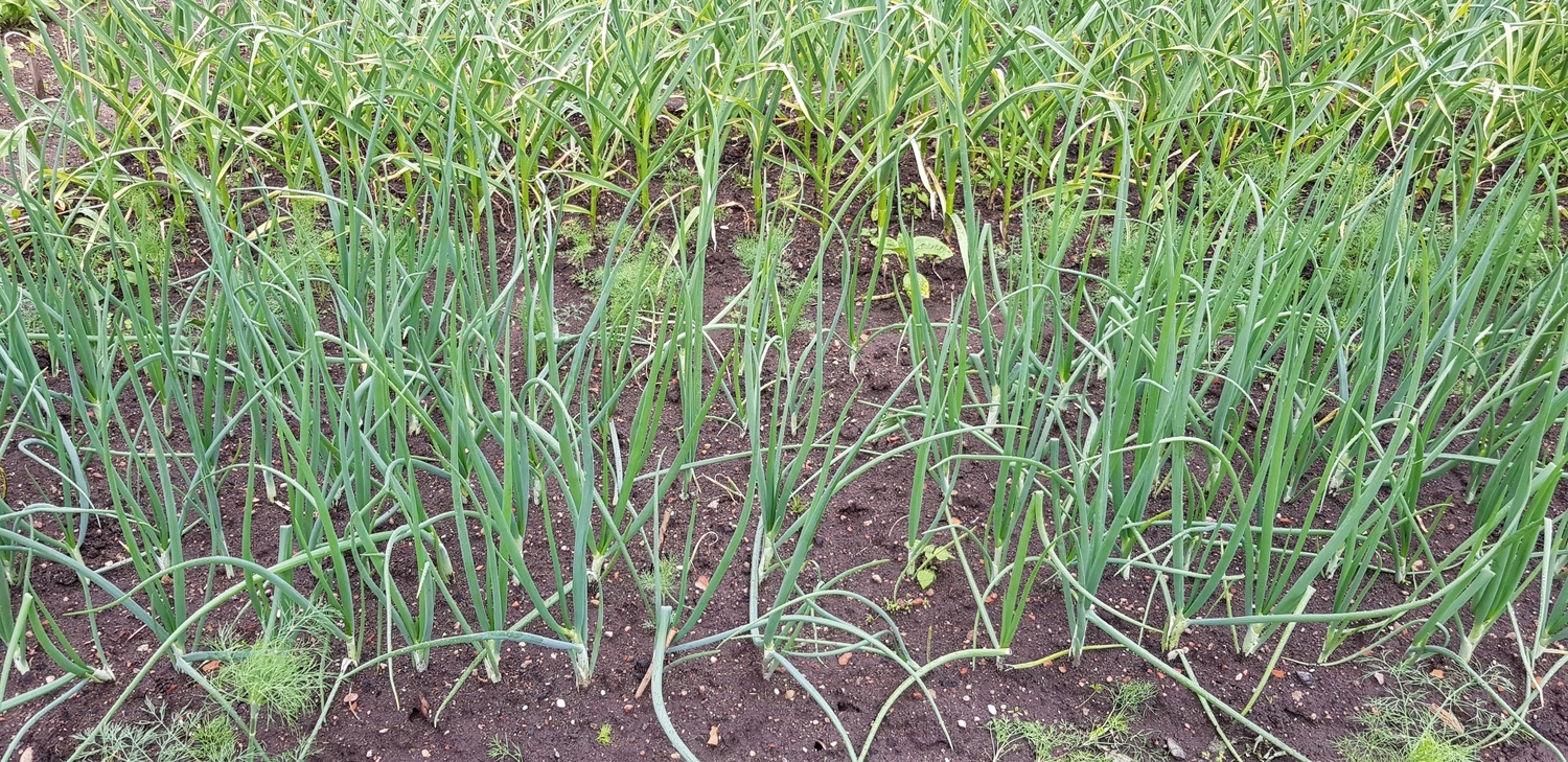 Onions are harvested when the stems bend over. Stuttgarter Riesen onions.