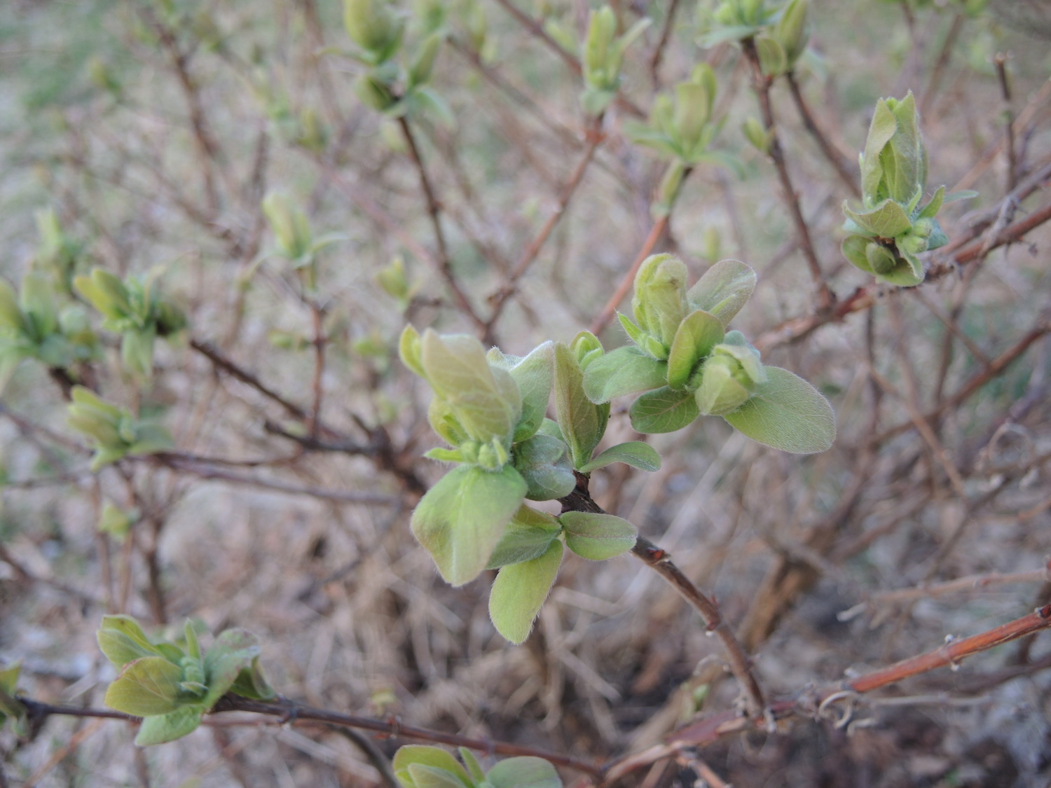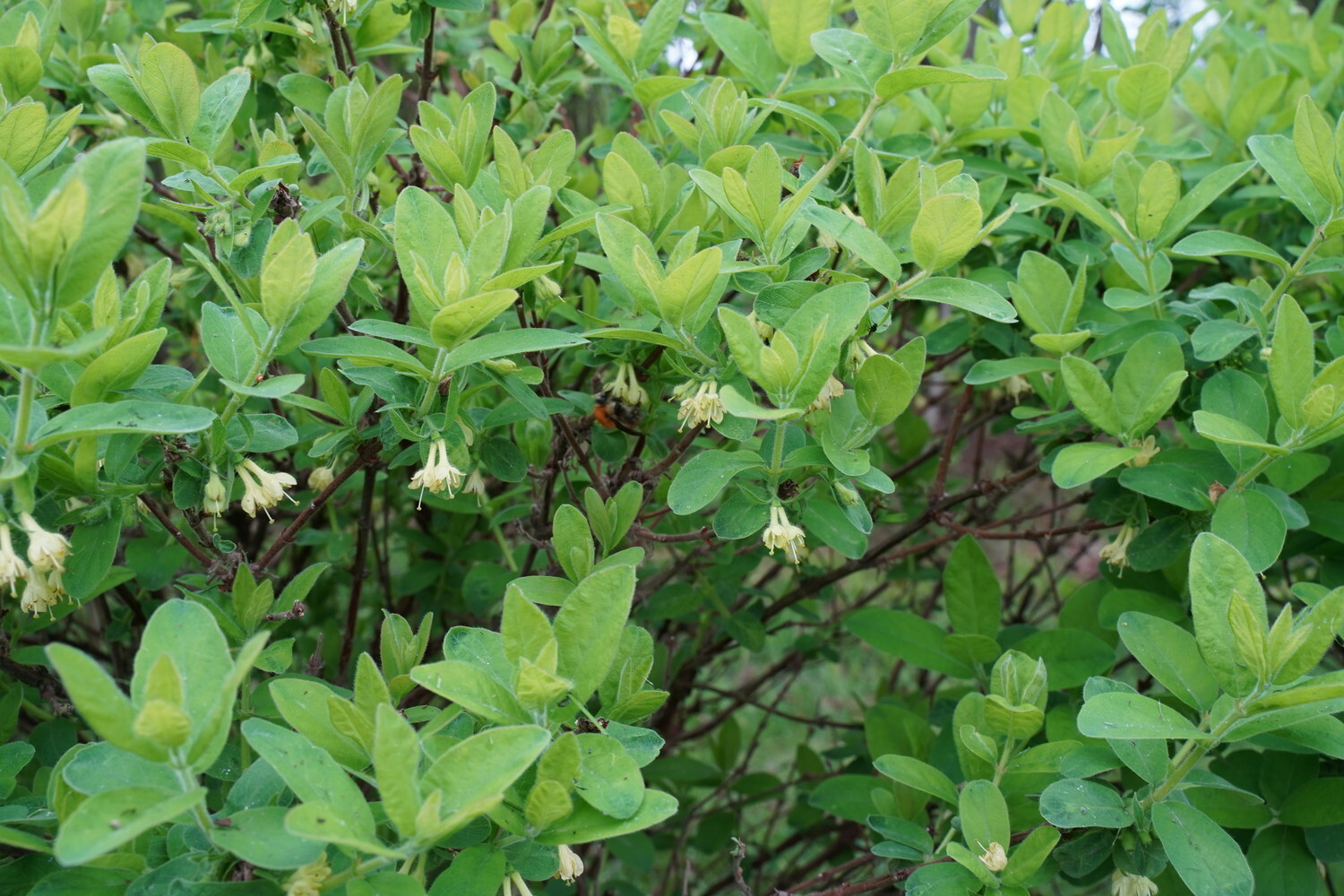 All forms of edible honeyberry are deciduous shrubs, growing up to 2.2-2.5 meters tall. The lifespan of a blue honeyberry shrub is 50 years or more. The leaves are oval-shaped, grayish-green, and covered with a light waxy coating. Their length can reach up to 8 centimeters, and their width up to 3 centimeters. The leaves are arranged opposite each other. Flower buds form on the previous year's shoots and begin to develop a few days after the spring warmth. The flowers are small, up to 2 centimeters in size, yellow, and bell-shaped in pairs. They appear in mid-March. Depending on the weather conditions, blooming lasts 20-25 days.
