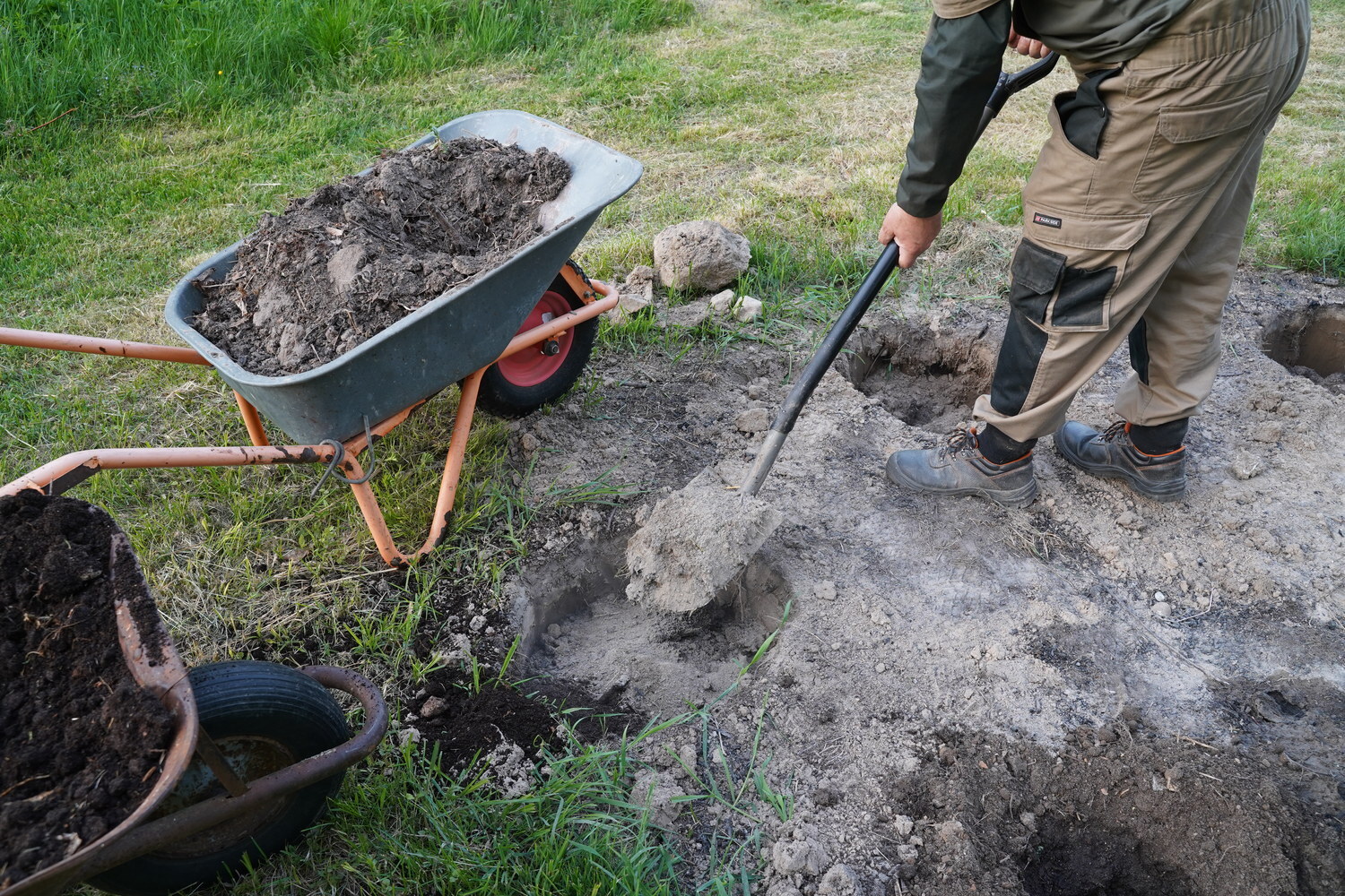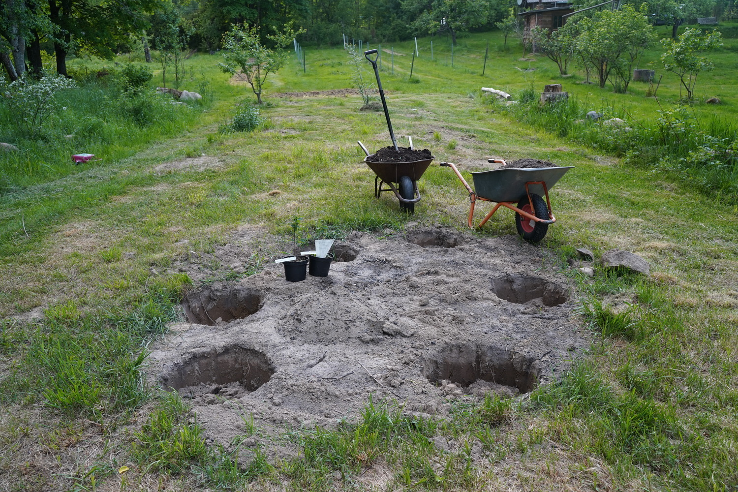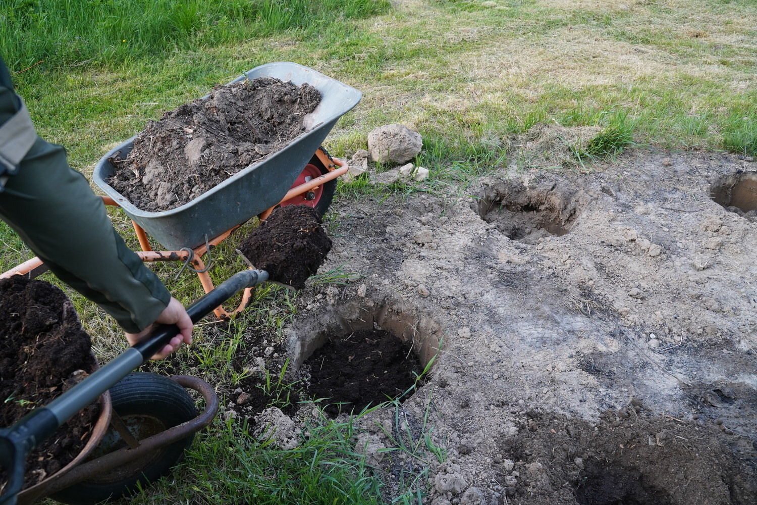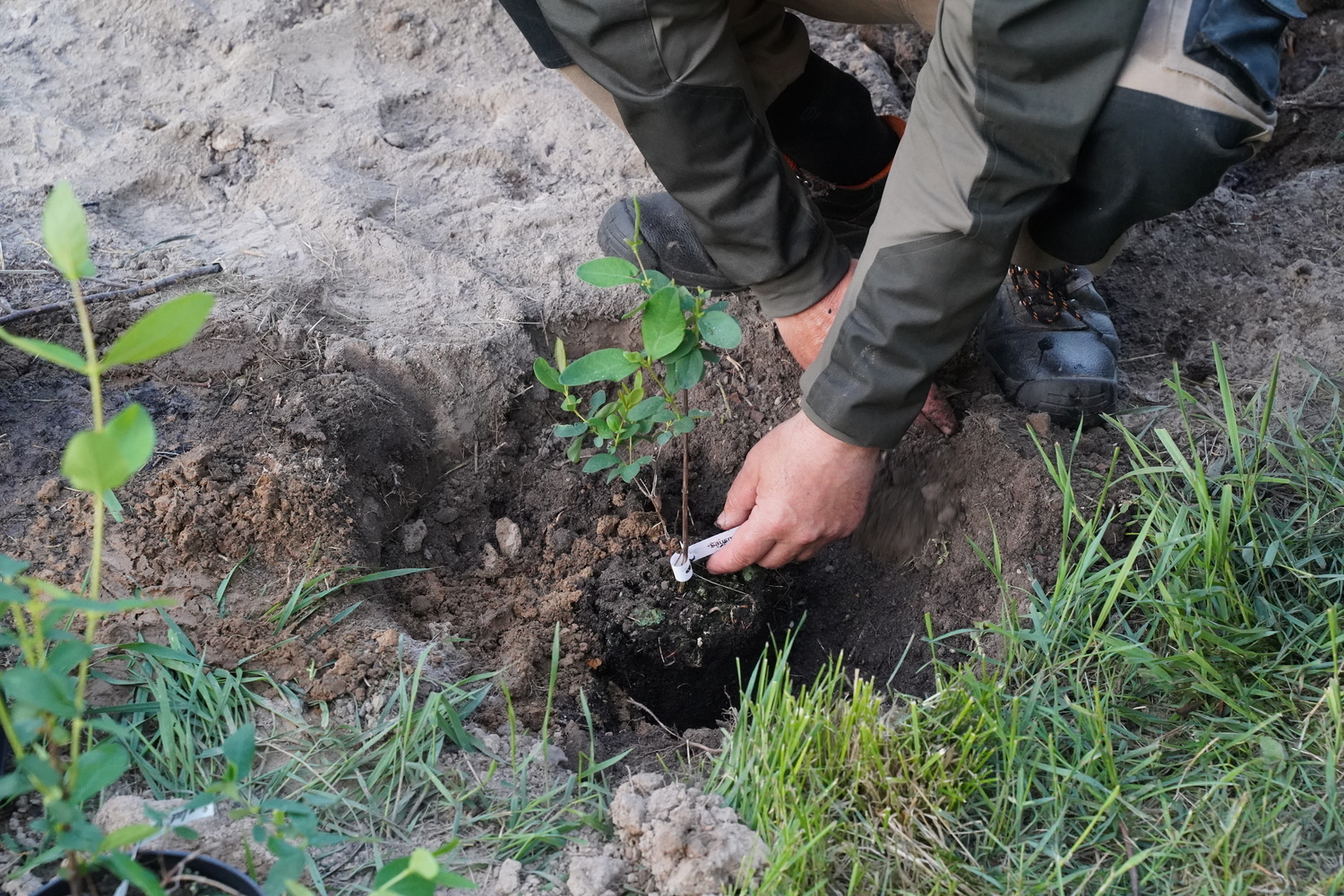 The mixture is stirred in the hole, and a hole is made for the seedling. A bucket of water is poured in, and you wait for it to be absorbed.