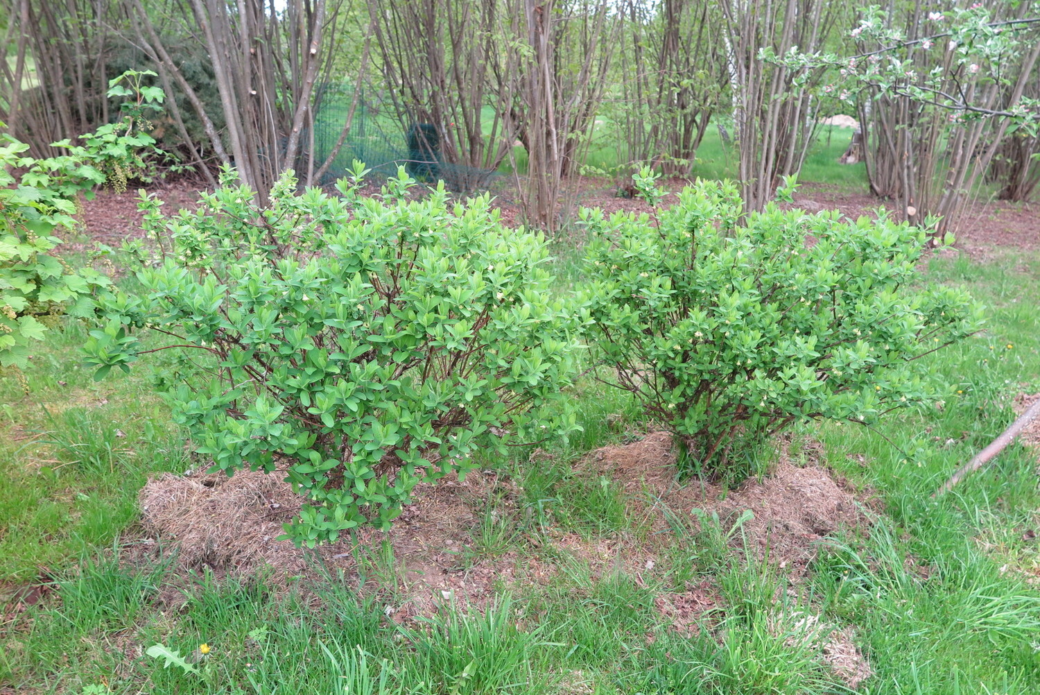 Honeyberry shrubs are planted in a circle, serving as a decorative element in the landscape. Similarly to this, blueberries are planted a little farther apart. Planting in a circle has many advantages. While the honeyberry reaches about 50-70 centimeters, it should be protected from deer, as they tend to nibble on the tops. The circular arrangement makes it easy to surround the plants with a continuous fence during the winter. By planting taller shrubs on the northern side and shorter ones on the southern side, a balanced amount of light is ensured for the shrubs. This also improves flower pollination.