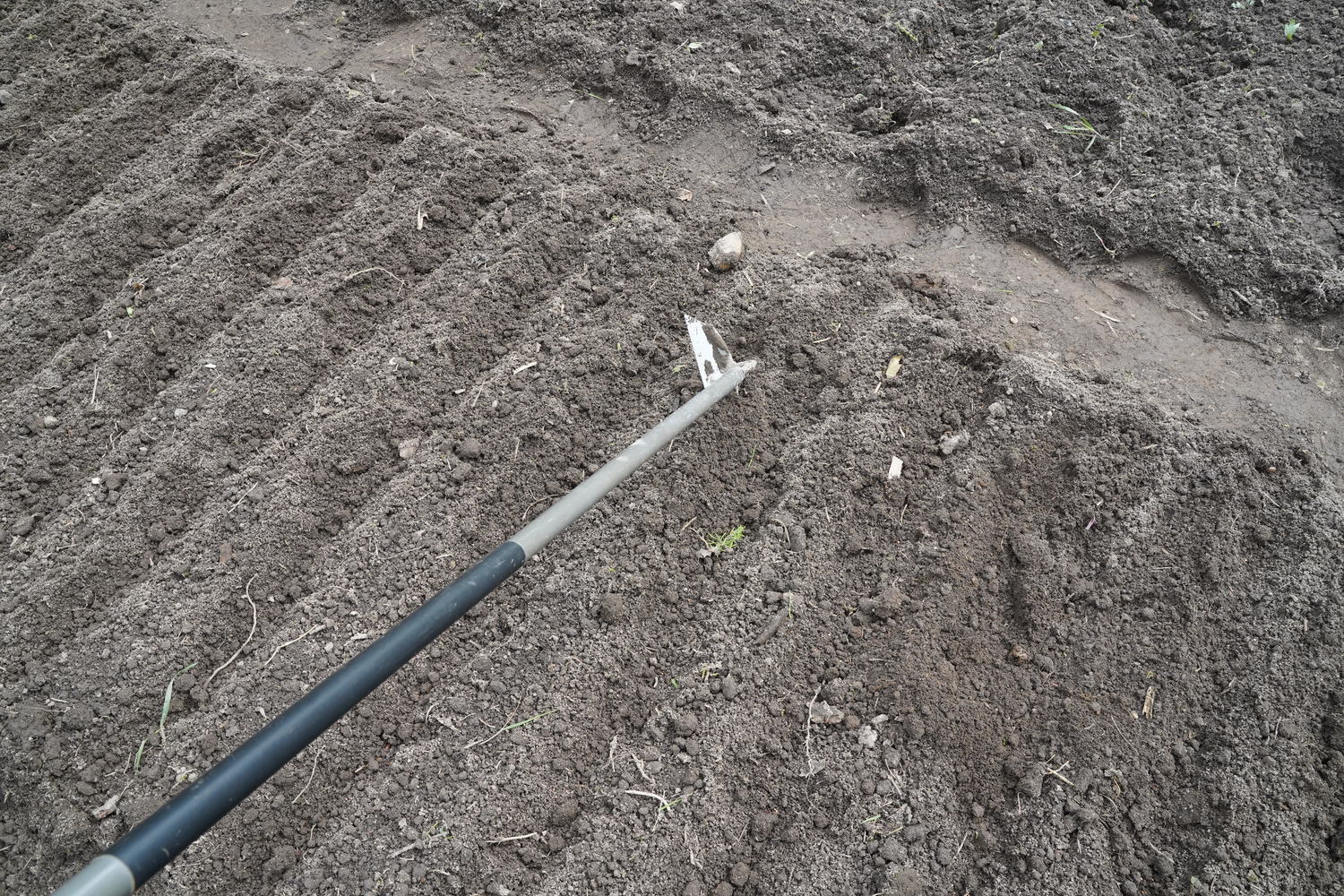 In the parsley furrows, radish seeds are sown every 20 centimeters, which allows for precise visibility of the parsley row. Using a hoeing tool, the between-row areas are regularly loosened to eliminate emerging weeds. After sowing the parsley, the soil surface is slightly compacted, which further reduces clumping.